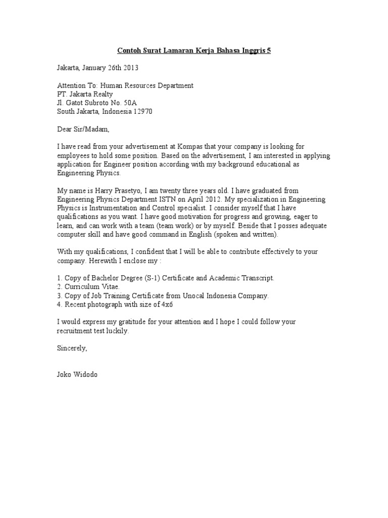 Seperti biasa, tak lengkap rasanya jika hanya membahas materi mengenai surat lamaran pekerjaan dalam bahasa inggris dan artinya tanpa mengetahui contoh suratnya. Secara umum format surat lamaran bahasa inggris sama dengan surat lamaran berbahasa indonesia Walaupun pada surat lamaran dituliskan kelebihan yang kita miliki namun kita tidak boleh terkesan menyombongkan diri. Bagi kamu yang sedang mencari contoh surat lamaran kerja bahasa inggris, artikel ini akan membagikan beberapa sample yang baik dan benar yang bisa kamu tiru. Pada prinsipnya, membuat surat lamaran pekerjaan dalam bahasa inggris sama halnya seperti ketika kita membuat surat lamaran pekerjaan dalam bahasa. Simak contohnya berikut ini kepada bapak atau ibu, nama saya salsabila ariani dan saya seorang fresh graduate dari universitas xxx. Seperti yang kalian ketahui bahwa membuat surat lamaran kerja menggunakan bahasa inggris terbilang sulit. Karena bentuk tata bahasa antara surat lamaran berbahasa indonesia tentu berbeda dengan surat lamaran kerja dalam bahasa inggris. Ada banyak referensi contoh surat lamaran kerja bahasa inggris singkat dan terjemahannya yang telah kami sediakan sesuai dengan berbagai kondisi keperluan anda dalam suatu file dokumen berbentuk file doc dan pdf (beda dari yang lain). Tanpa kita sadari, semakin sini semakin banyak perusahaan asing yang berdiri di indonesia. Namun, mengirim surat lamaran kerja menggunakan bahasa inggris yang ditujukan pada perusahaan tertentu, akan lebih menarik dan menunjukkan sebagai pendamping cv (curriculum vitae), berikut contoh surat lamaran kerja dalam bahasa inggris yang bisa kamu pelajari dan tiru. Contoh surat lamaran kerja bahasa inggris untuk posisi accounting. Jika kamu menulis surat lamaran dalam.